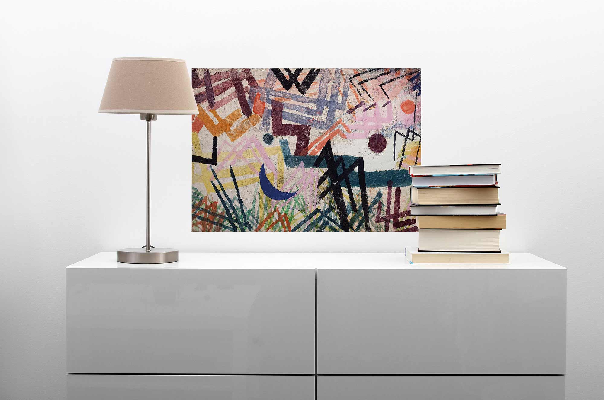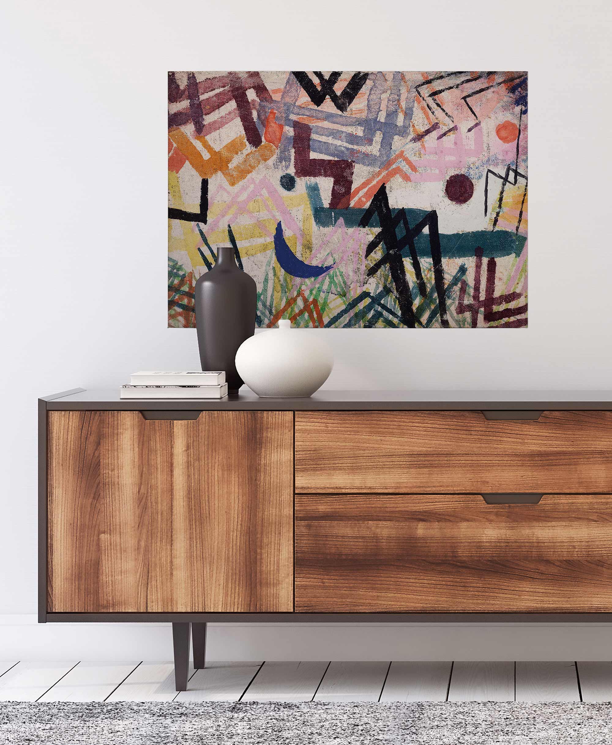 Richte die Bildmitte auf ca. 145 bis 155 cm über Boden aus. Über Sofa oder Sideboard 10 bis 20 cm oberhalb der Kante hängen, damit das Ensemble geschlossen wirkt.