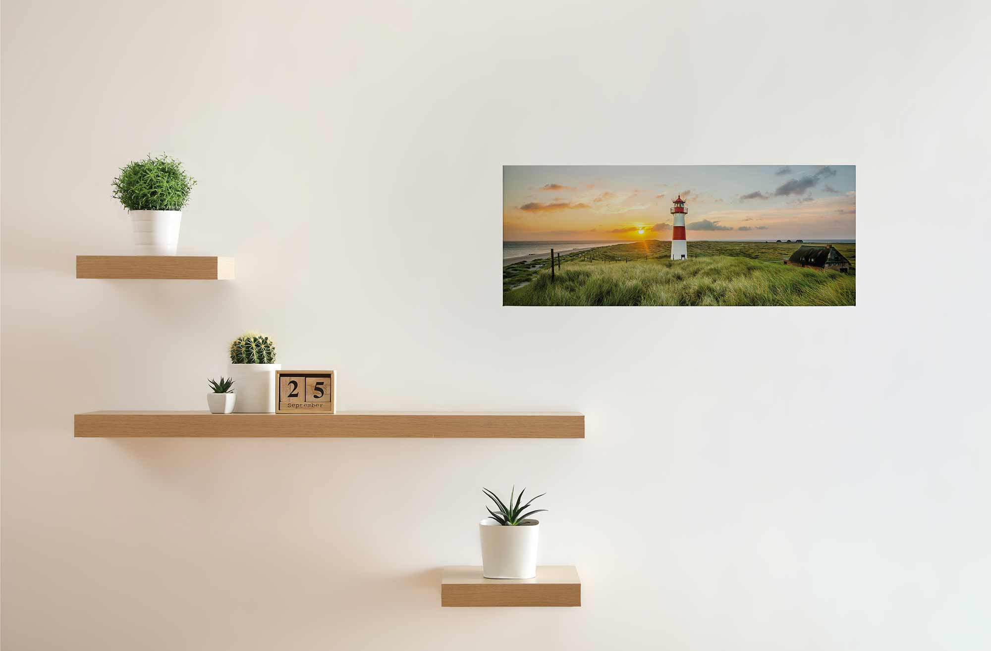 Richte die Bildmitte auf ca. 145 bis 155 cm über Boden aus. Über Sofa oder Sideboard 10 bis 20 cm oberhalb der Kante hängen, damit das Ensemble geschlossen wirkt.