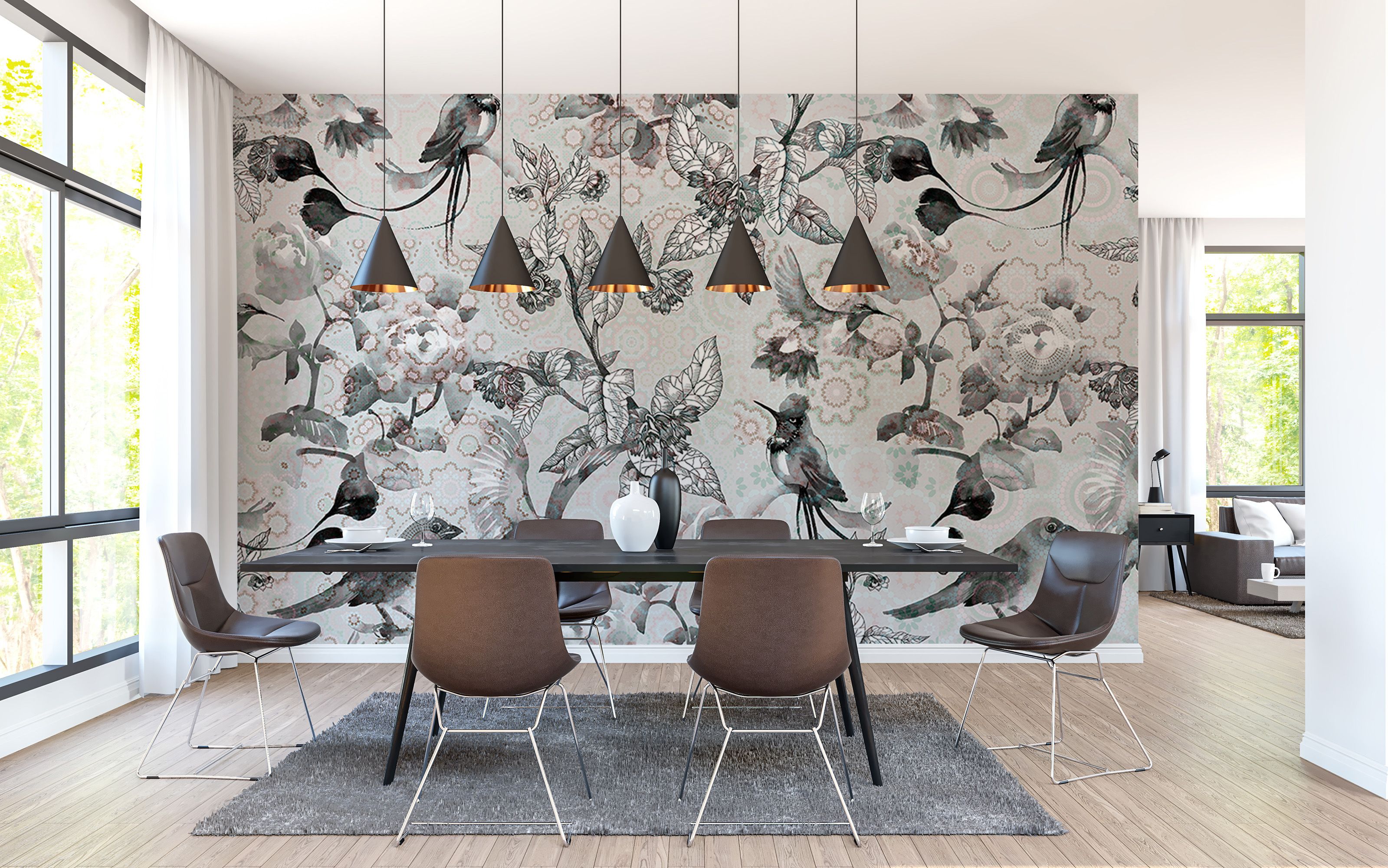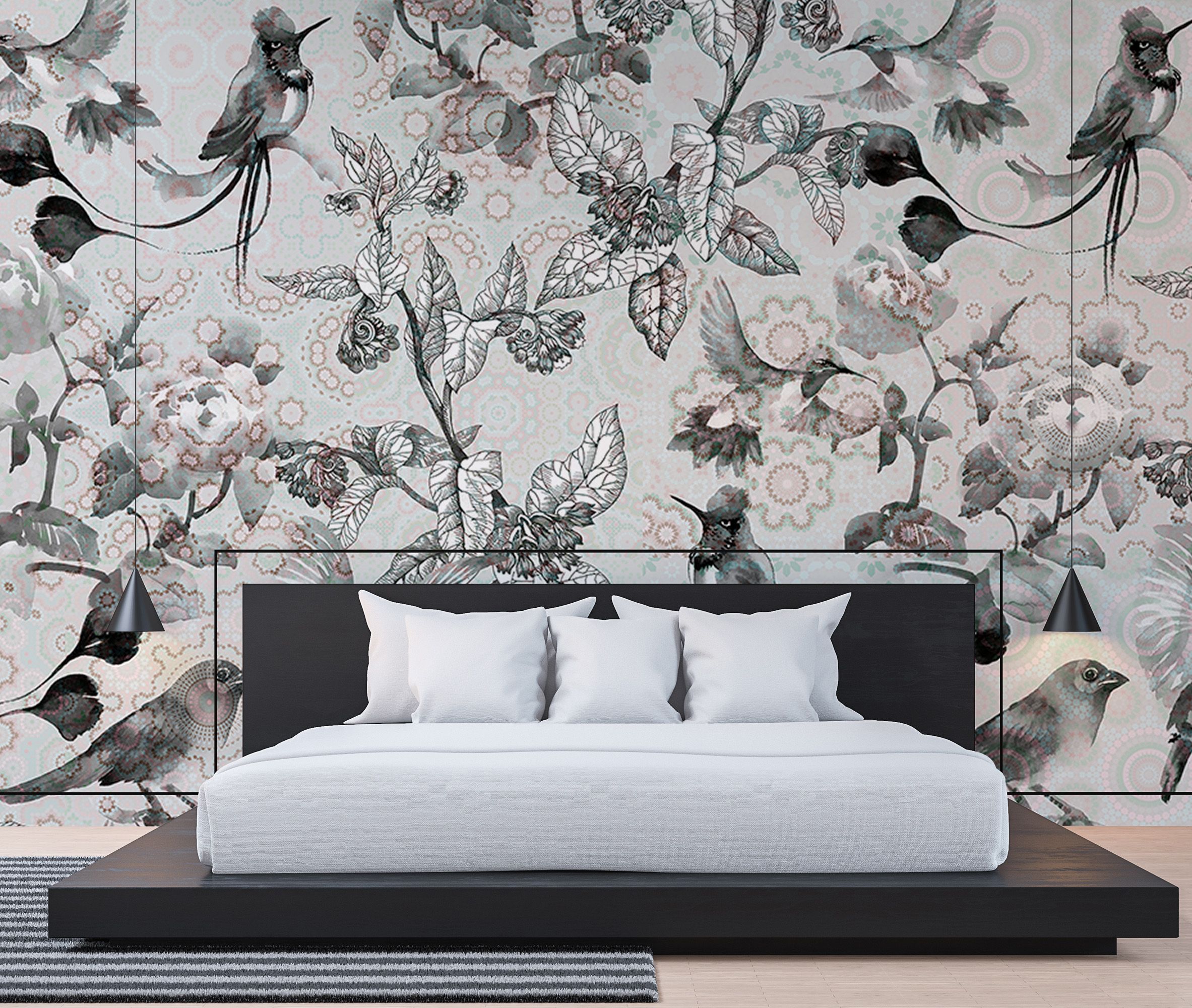 Tadessi Fototapete Blumen M1-No.60571 Digitaldruck Tapete Grau Weiß - Vögel