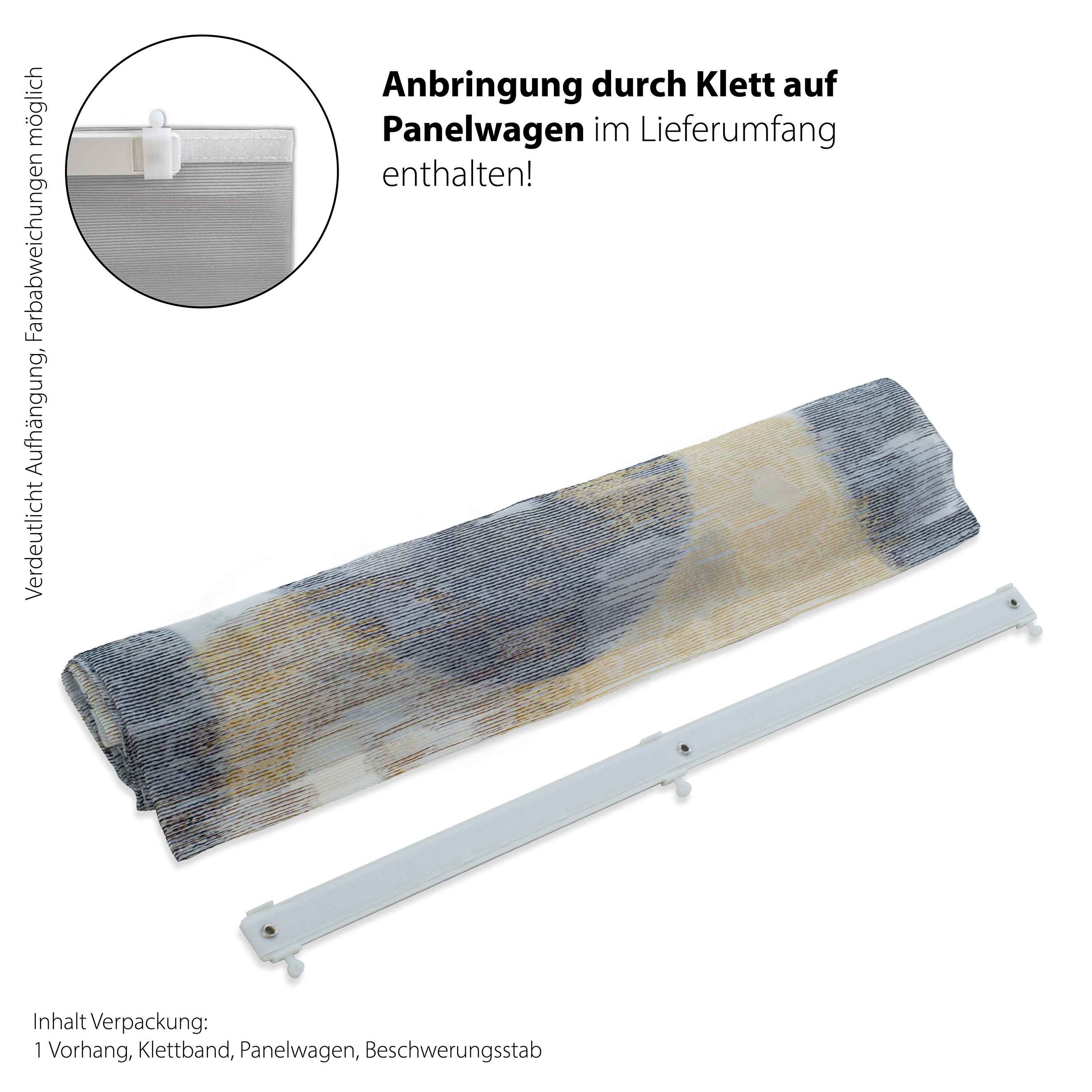Paneelwagen und Beschwerungsstange sind im Lieferumfang enthalten. Die Aufhängung erfolgt mittels des Klettbands.