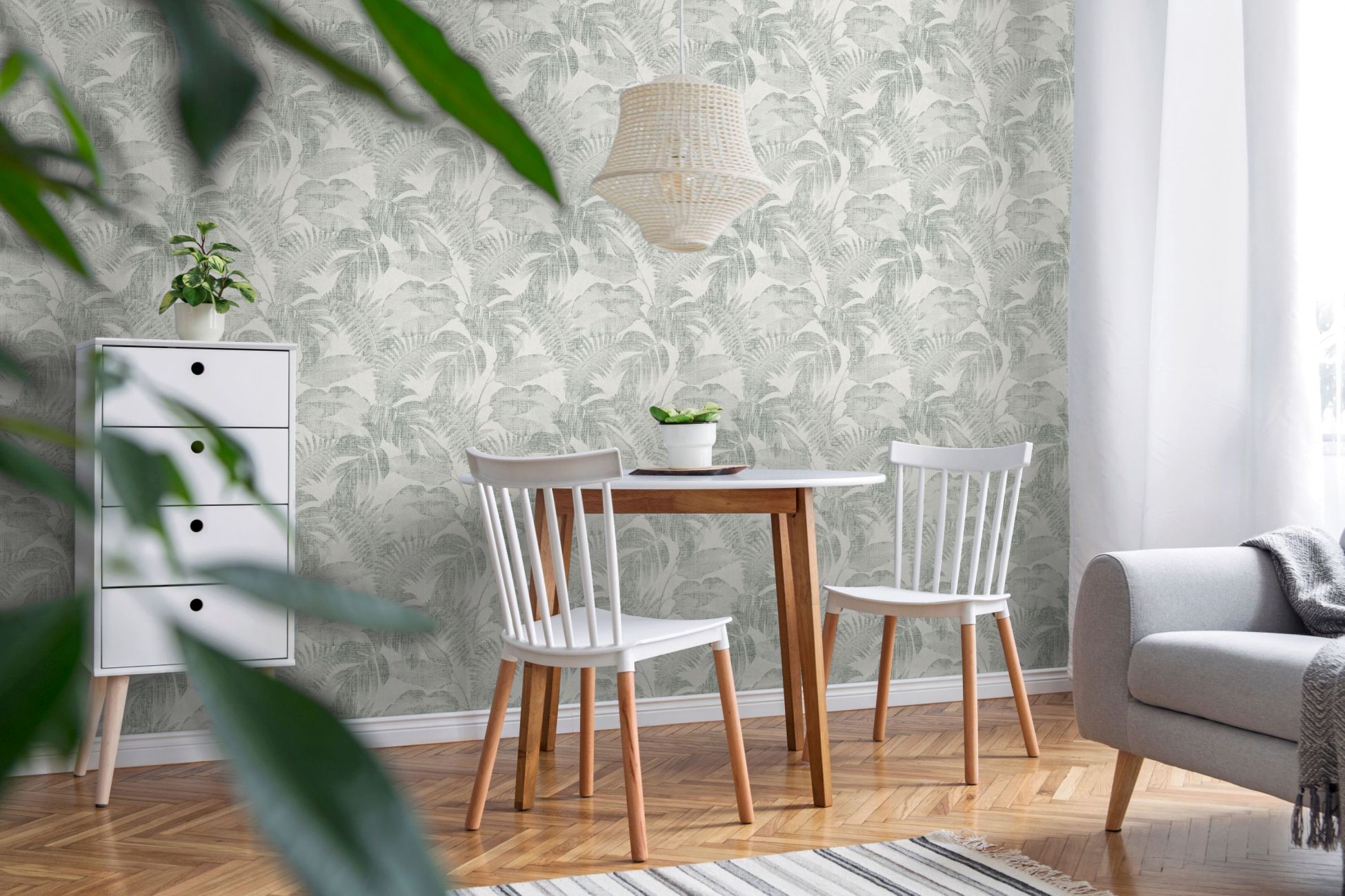 Tapete Dschungel-Optik M1-No.12053 | Vorgeleimte Vliestapete Palmen | Grün | Grau | Wohnzimmer