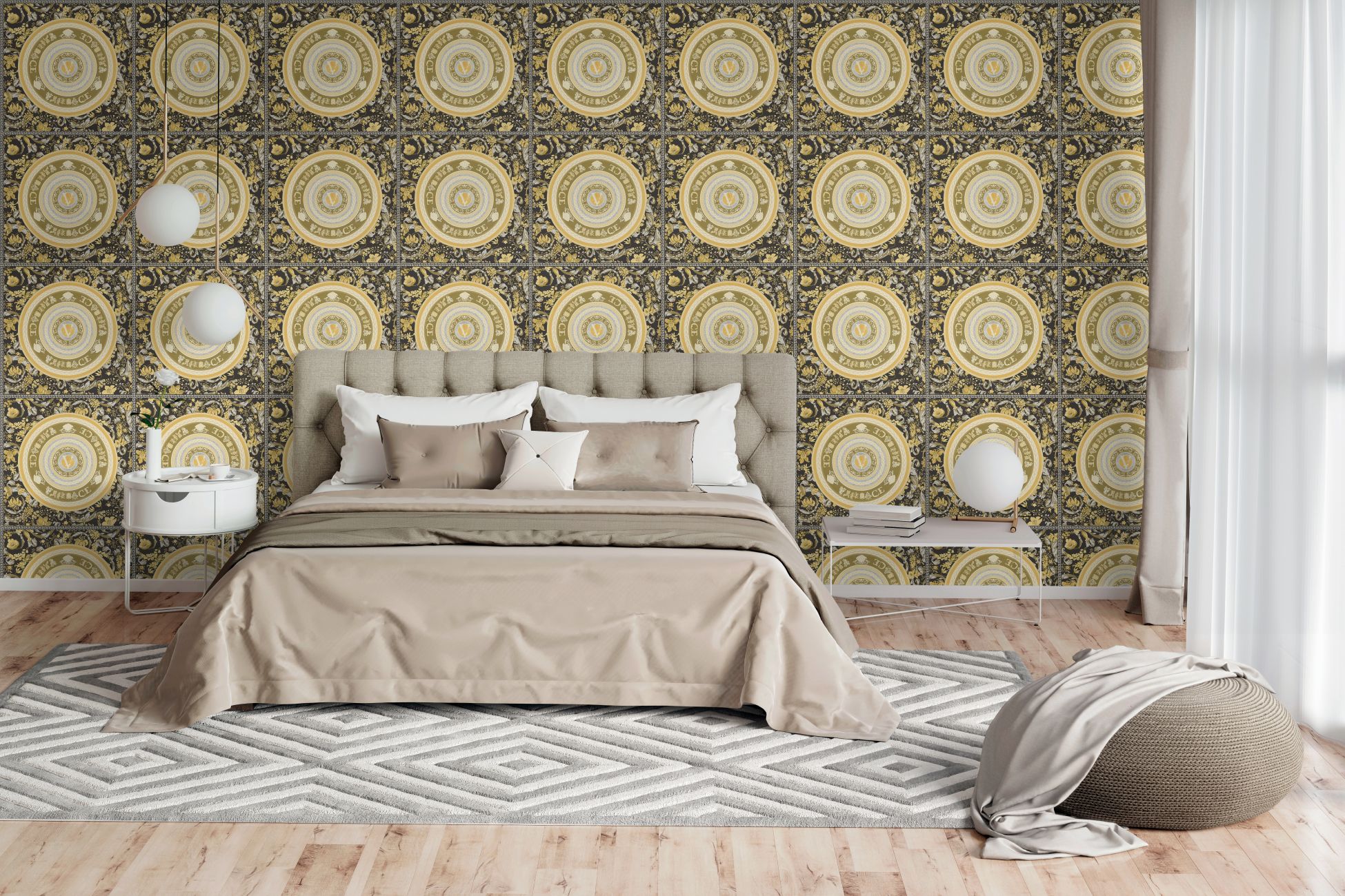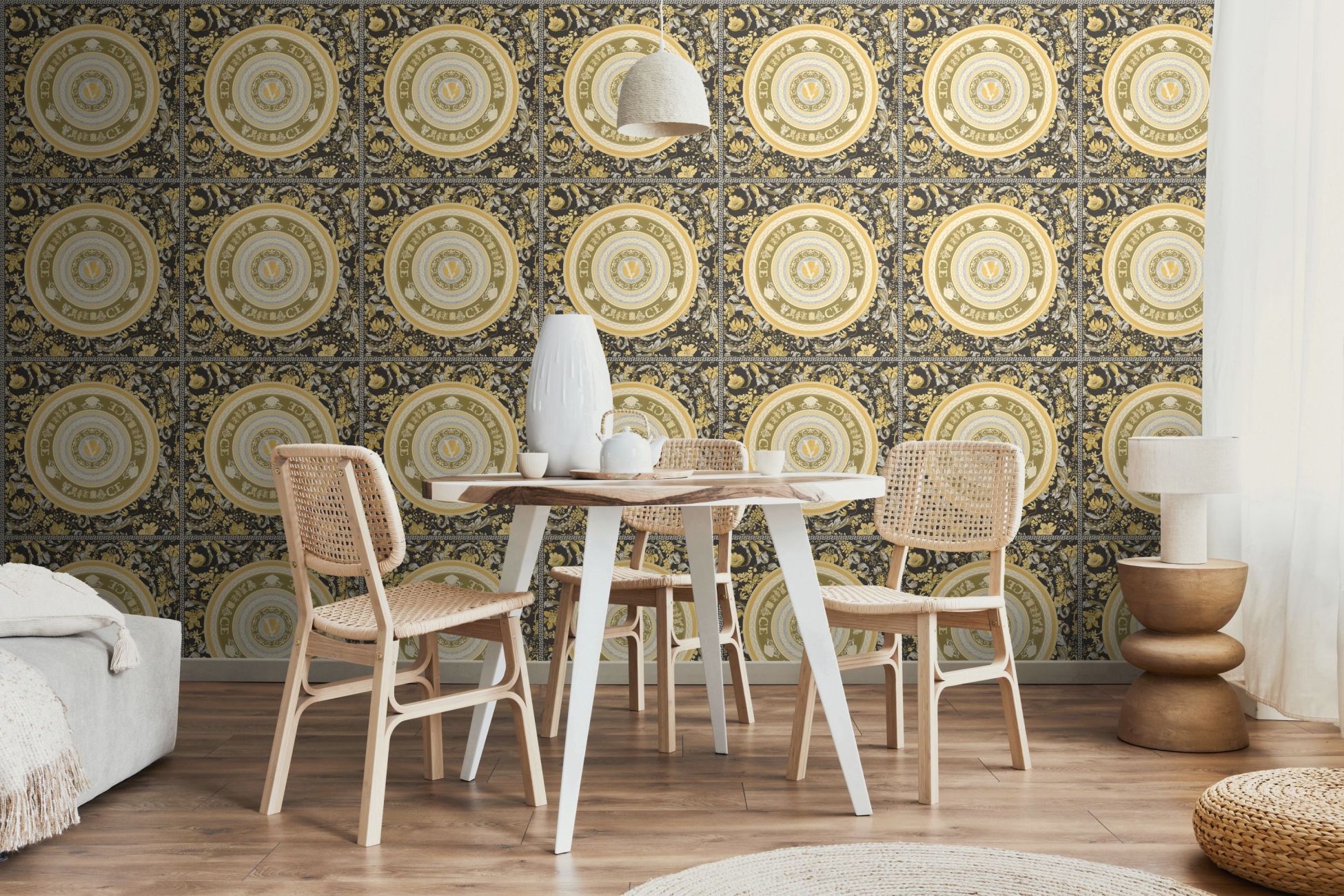 Tapete Versace Floral M1-No.11541 | Vliestapete Design | Gold | Schwarz | Floral | Kreise | Medusa